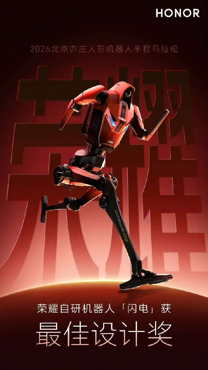 荣耀机器人“闪电”首次参加2026年北京亦庄机器人半马比赛不仅夺冠更一举包揽冠亚季军及前六,齐天大圣队、雷霆闪电队、星火燎原队分别夺得冠军、亚军、季军,净用时分别为50分26秒、50分56秒、53分01秒,三支战队的参赛机器人均为自主导航机器人。在遥控组别方面,午夜影院+真爱禁区“闪电”最快净时长成绩仅为48分19秒(因赛事规则遥控组需X1.2系数,故排名靠后)荣耀机器人打破人类半马世界纪录。此外荣耀自研机器人“闪电”还收获最佳设计奖,小型机器人“元气仔”因最美跑姿收获“最佳步态奖”。