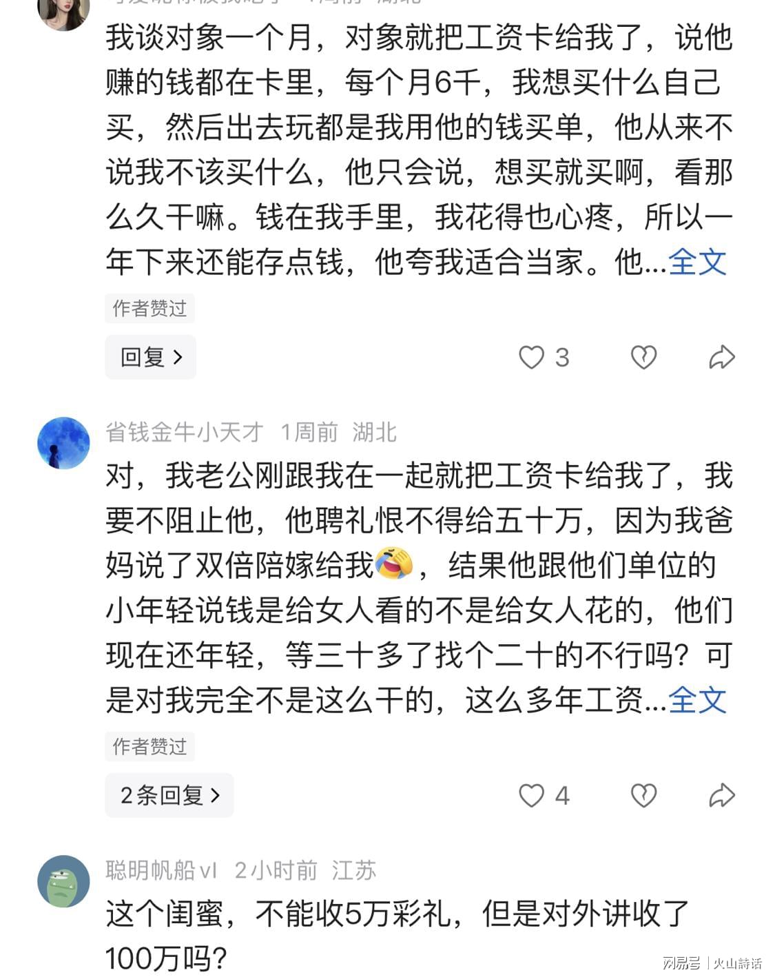 有网友跟帖,对,我老公刚跟我在一起就把工资卡给我了,我要不阻止他,他聘礼恨不得给五十万,因为我爸妈说了双倍陪嫁给我。结果他跟他们单位的小年轻说钱是给女人看的,不是给女人花的,他们现在还年轻,等三十多了找个二十的不行吗?可是对我完全不是这么干的,这么多年工资都上交,先锋影音+app单位发点外快都全给我,我说你对别人可不是这么说的,你咋不三十多在找对象,他说我又不傻,我又不是高富帅,等我三十多连年轻这个优势都没了我还找个屁,年轻女孩只是小又不是瞎。