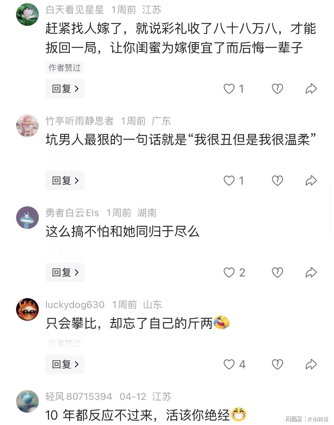 有网友调侃,赶紧找人嫁了,就说彩礼收了八十八万八,才能扳回一局,让你闺蜜为嫁便宜了而后悔一辈子。