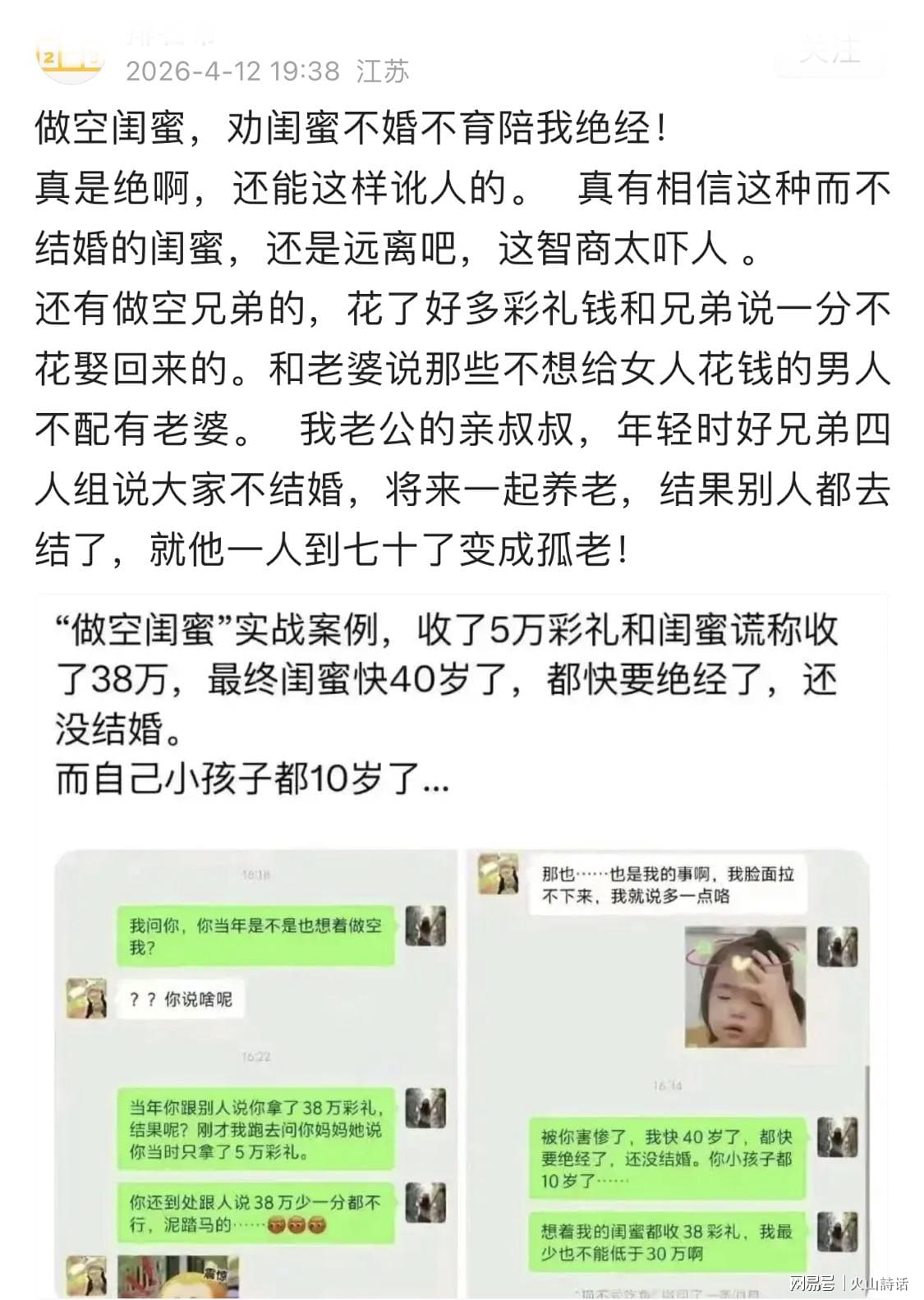 兄弟间的“做空”更加现实。一边怂恿别人不用重视彩礼,一边自己娶妻生子精心筹备;一边嘴上喊着一起不婚养老,一边悄悄恋爱成家,把当年的约定抛在脑后。人性本就趋利避害,真正面对婚姻、家庭、安稳生活时,很少有人愿意为一句空话放弃幸福。那些信了鬼话、坚守约定的人,最后往往成了唯一的输家,就像帖子里那位老人,年轻时与兄弟相约不婚,古稀之年却落得孤苦无依,令人唏嘘。
